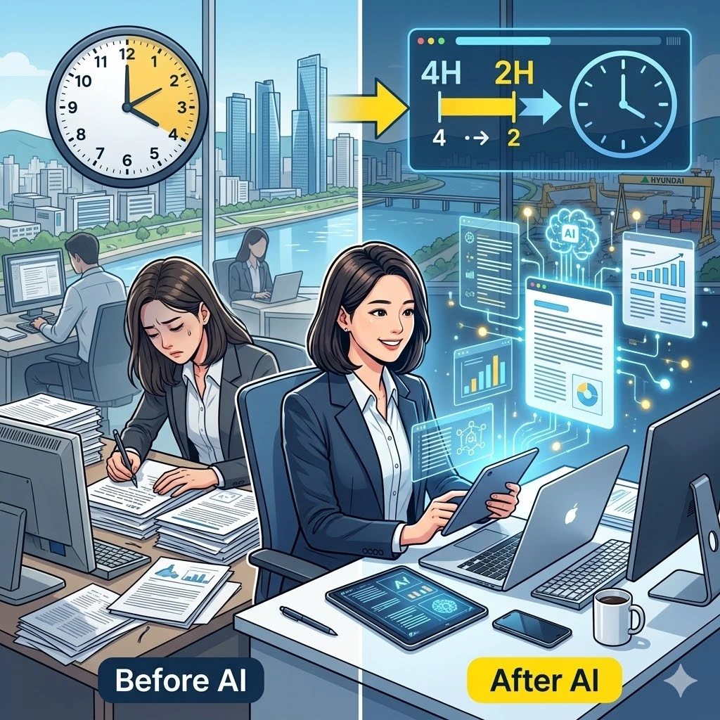 특히, 단순 반복이 많은 '자료 조사'와 '목차 구조화' 단계에서 시간 단축 효과가 가장 극적으로 나타났으며, 직장인들은 여기서 절약된 시간을 '최종 검토 및 인사이트 고도화'에 집중 투자하여 보고서의 최종 품질(Quality)을 훨씬 더 끌어올린 것으로 나타났습니다.